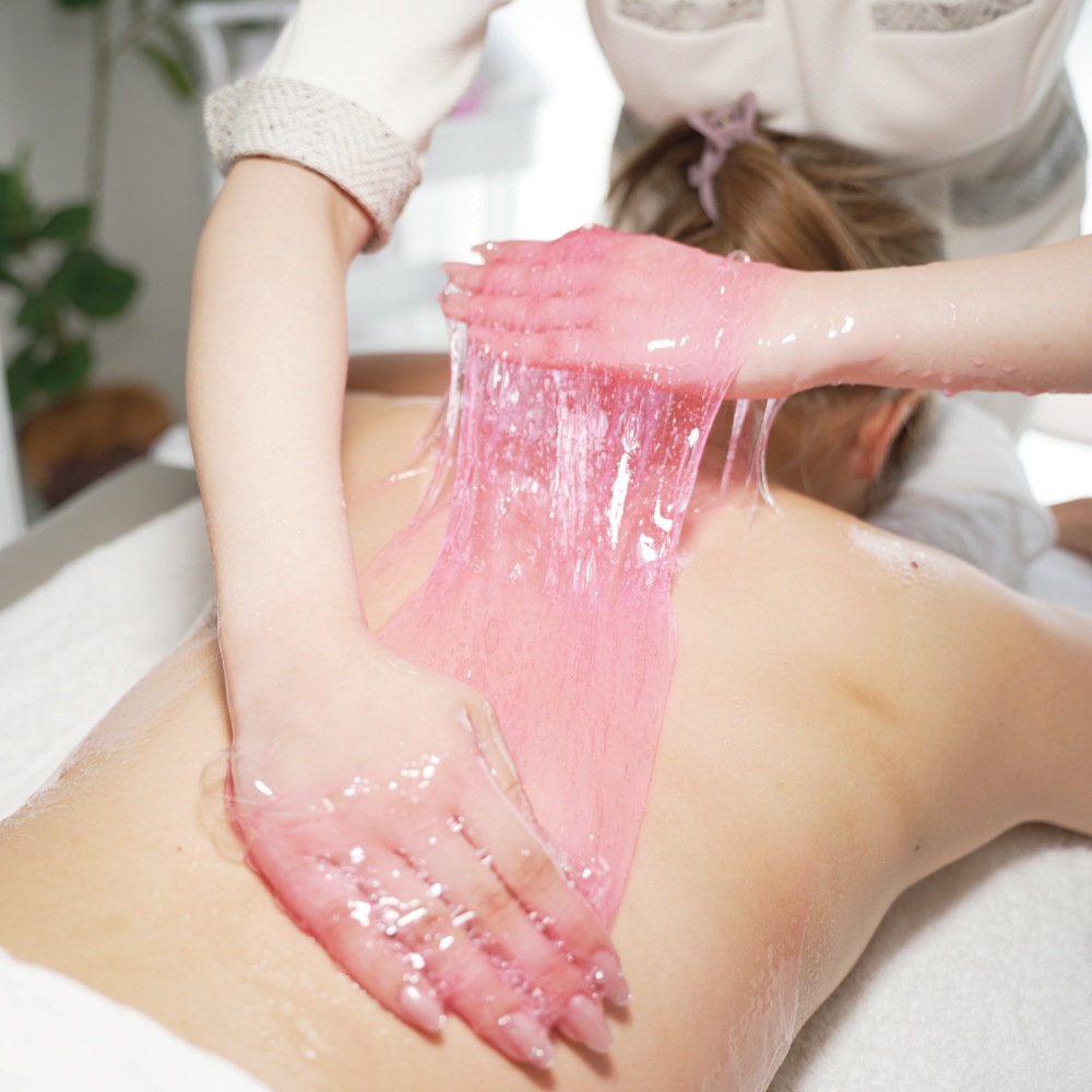 適量を手に取り、全身に薄く伸ばして施術してください。拭き取り・洗い流しが簡単です。