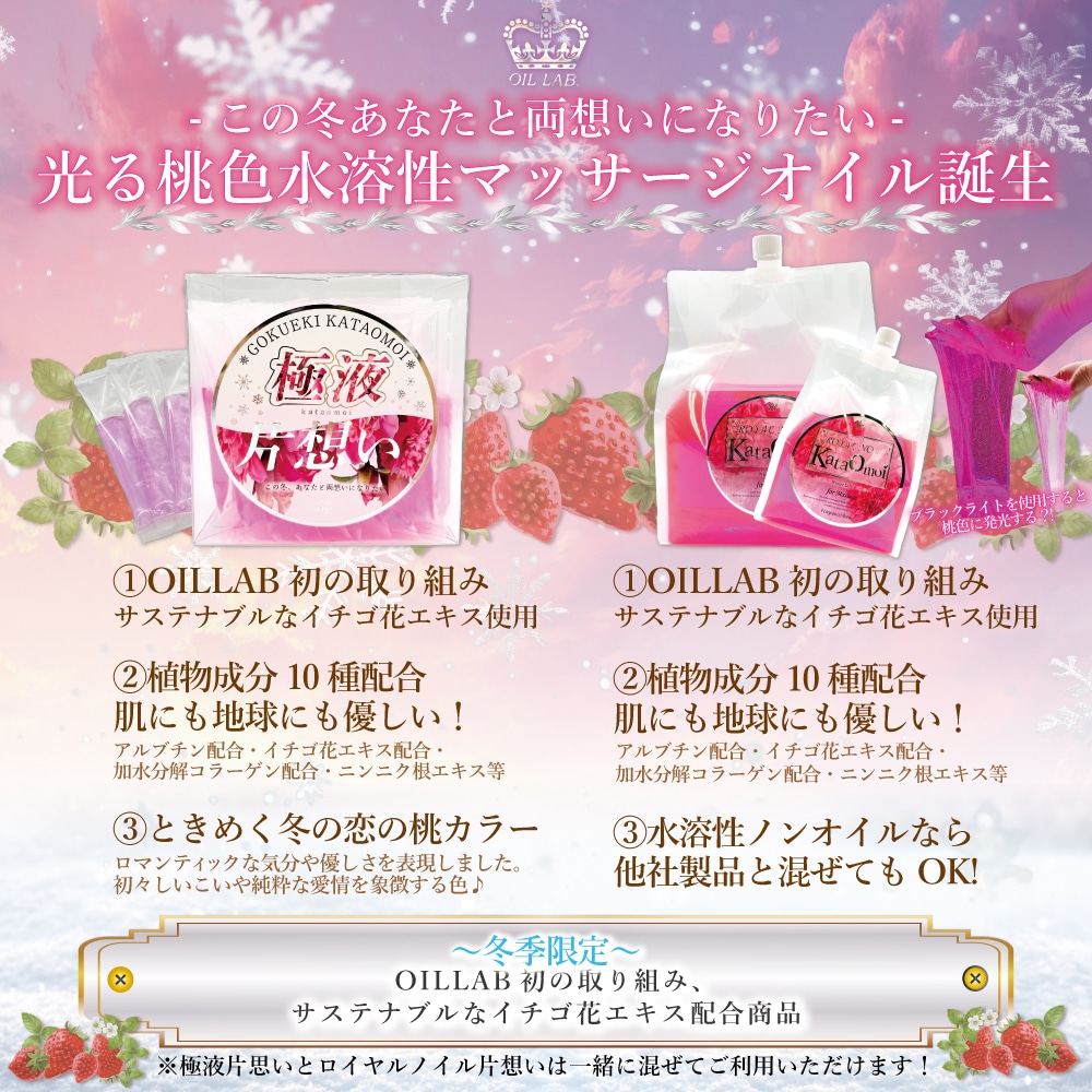 片想いシリーズの原料には、"美味しいイチゴを作るために摘まれてしまったイチゴの花" を活用しています。桃色×イチゴ花エキス、植物由来の美容成分を多数配合。