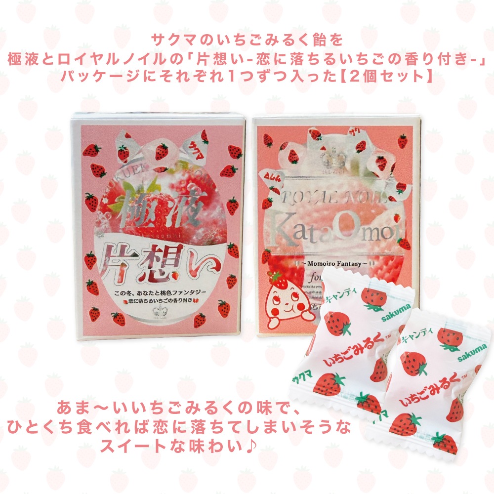 極液とロイヤルノイルの「片想い-恋に落ちるいちごの香り付き-」パッケージにそれぞれ1つずつ入った【2個セット】でお届けします!